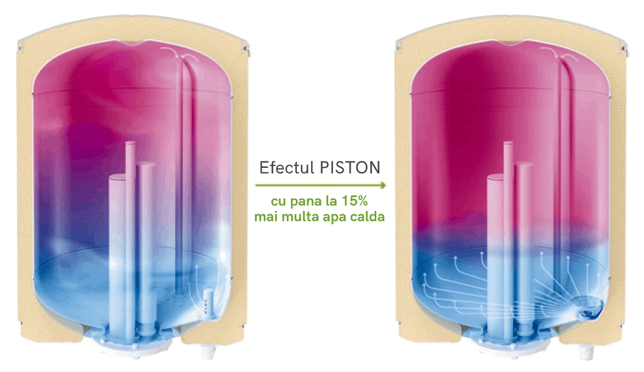 PISTON EFFECT pentru control al vitezei apei de admisie si pentru cresterea cantitatii apei calde cu pana la 15%;