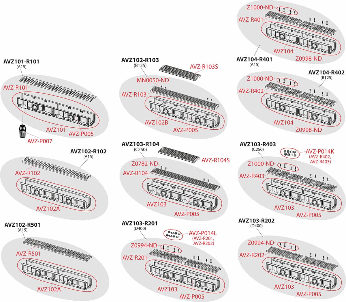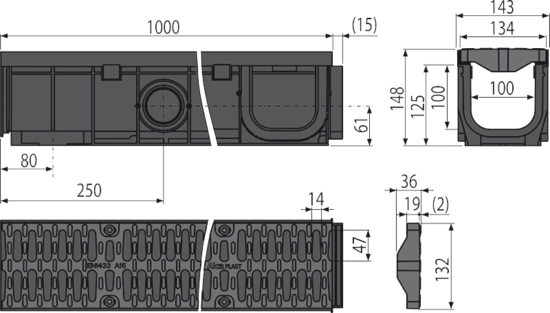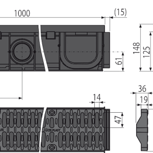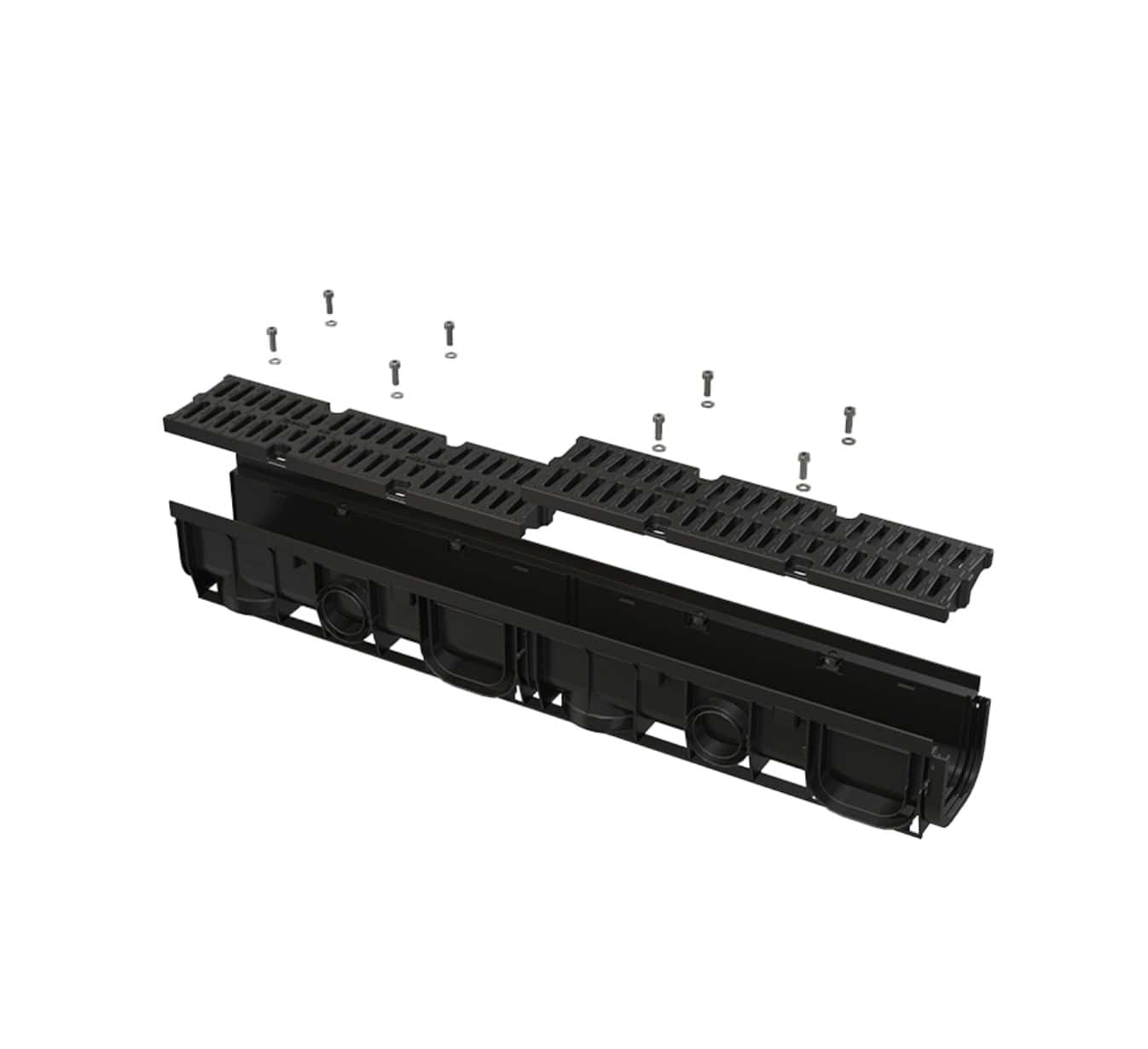 - Grătar din plastic – fixat la canalul de scurgere cu opt șuruburi din oțel inoxidabil, perforații 14 mm